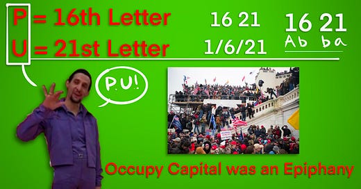 P is the 16th letter of the alphabet while U is the 21st. Writing those numbers in sequence we get 1621, which can function as 1/6/21- the date of the so called insurrection on January, 6th 2021.